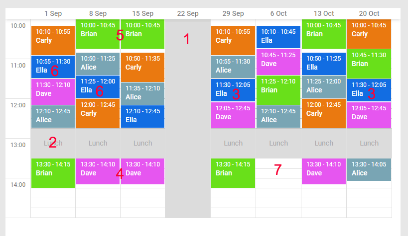 5. Brian also has consecutive lessons because these times are set under 'Rules', again overriding the default.