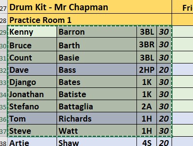 If you have a list of pupils in a spreadsheet or in a csv file you can paste the data directly into the pupil list. The data columns (fields) should be in the order: christian name, surname, form, and lesson length. Here's a view of a typical Excel list showing the copied area: